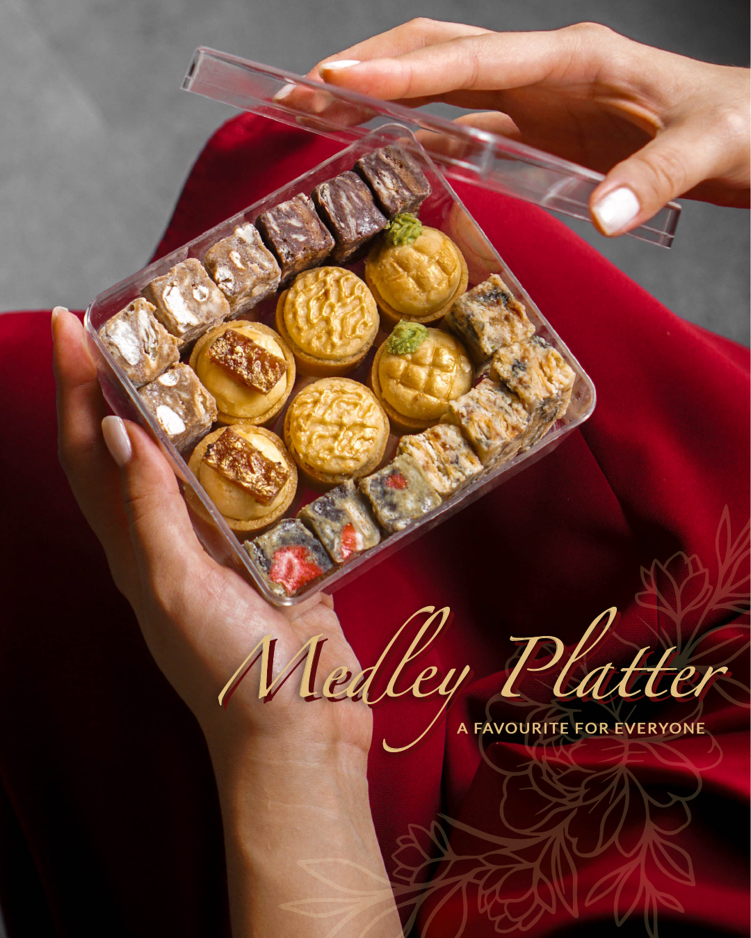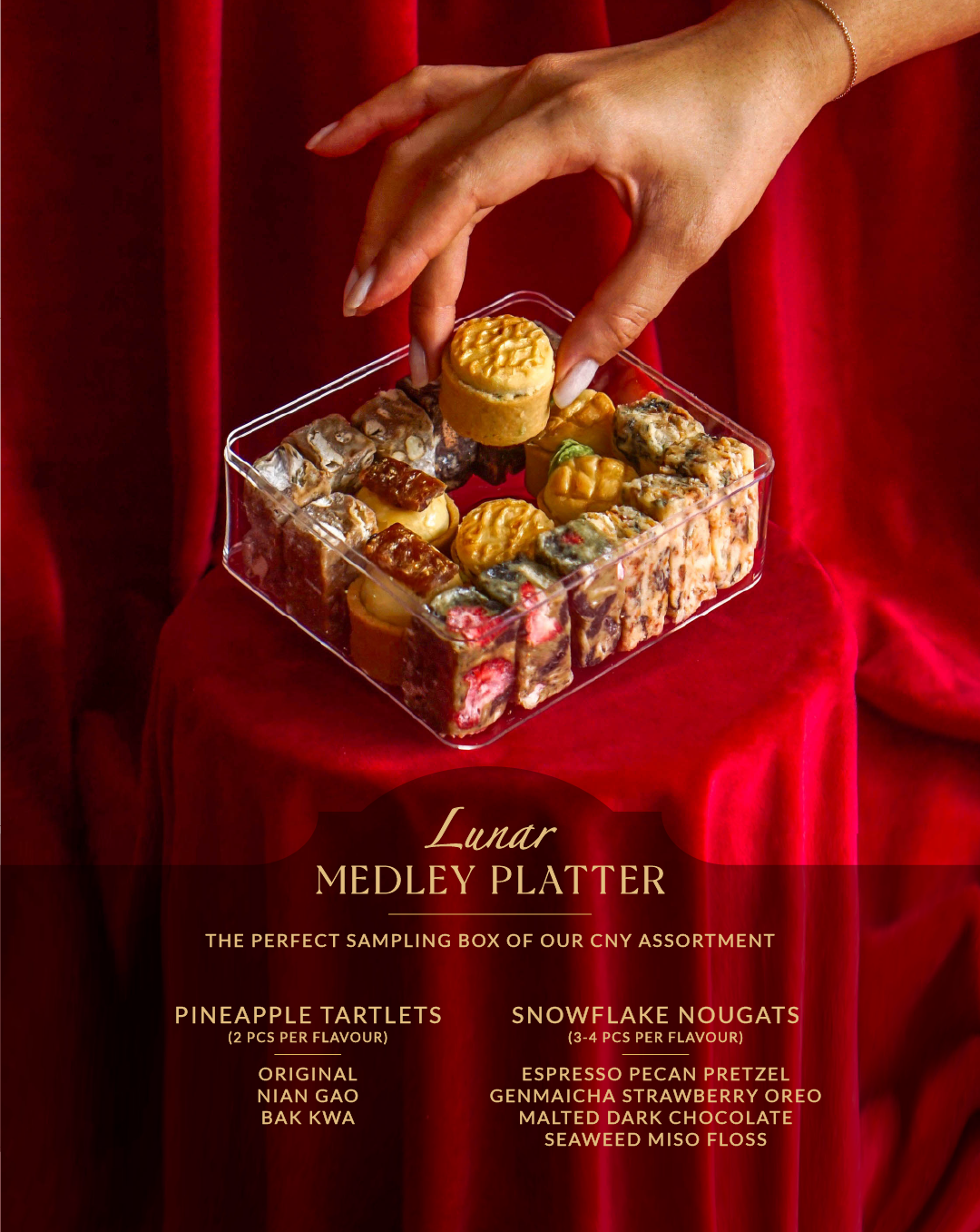 Each tartlet measures around 3.5cm across. Each snowflake nougat is approximately 4cm long. Flavours are FIXED in the medley, no switching of items/flavours allowed.